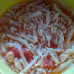 热锅倒入油把准备好的蒜末炒香,西红柿入锅出香味,放煮面翻炒加水少许(半碗左右),再把土豆倒入锅中,加少许鸡精和适量盐。