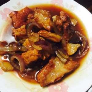 小火熬冰糖 成焦糖色 倒入排骨 翻炒倒开水 加盐酱油 煮开倒入洋葱 盖盖子 40分钟左右