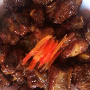在锅里加入少量油 加热 放入冰糖 熬糖。注意不能糊锅 把糖熬到暗褐色