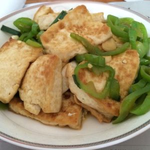 倒入少量的油,大蒜爆香,放入青椒翻炒,青椒熟了就可以加入刚刚煎好的豆腐了。然后再滴入少量酱油,鸡精。翻炒几下就可以出锅了。