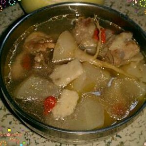 排骨飞水,萝卜带皮洗净切滚刀块,云苓、枸杞稍微泡下水