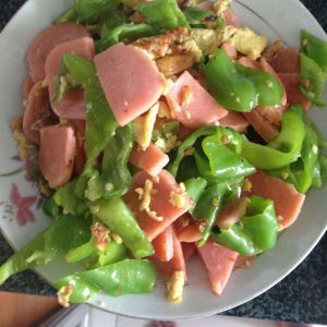 当青椒和香肠差不多好了时 放入鸡蛋继续炒一会 放入盐 味精调味