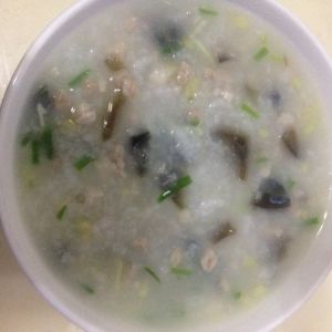 肉和大米熬出香味后 把切好的皮蛋丁倒入锅内熬制10分钟左右 加入生姜末葱花 根据个人口味调制 美味又营养的粥就完成了 可以开吃咯