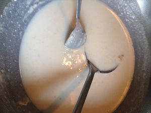 加入牛奶和冷水,不停搅拌!用冷水可以防止变成面疙瘩