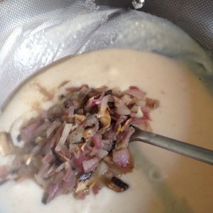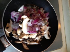 换一平底锅,放黄油抄洋葱和蘑菇,洋葱透明,蘑菇断生就可以了!
