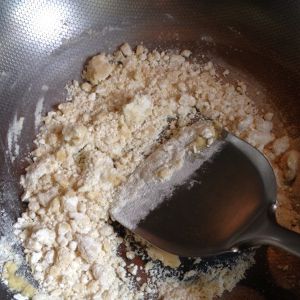黄油化开后放入面粉,抄到黄色。这步建议面粉少放点先!