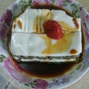 和做木糠蛋糕一样一层一层的放,豆腐一层皮蛋一层,最底下一定要豆腐因为要反过来