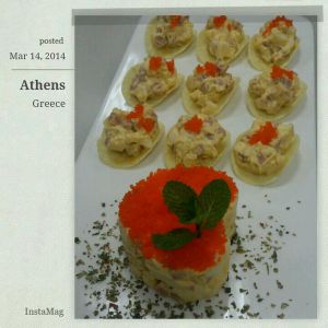 其实到第三步已经ok了,不过我要再它换个美美的新装。用心型模具放入拌好的色拉压实再放上飞鱼子,插上一片薄荷叶,洒上大半圈意大利香菜,一下子高大上了有木有?