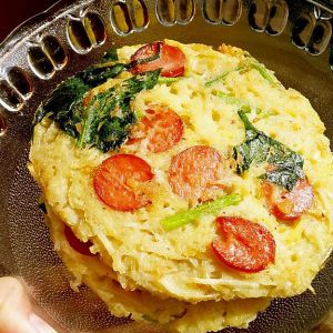 油开小火煎。用大汤勺舀食材。倒入油开的锅中。趁上面还没熟。将之前准备的菠菜跟肠放入。放好后将饼翻面。来回翻这煎四分钟左右出锅。