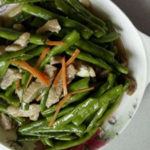 然后加入蒜瓣爆香加入四季豆同炒边加入耗油、盐、味精、加水等熟了再加入萝卜丝。