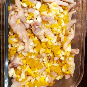 鸡爪剪掉指甲,切两半。放锅内水烧开后小火煮15-20分钟。个人比较喜欢煮烂一点的,煮到鸡爪皮裂开一点点,下面图片这样。