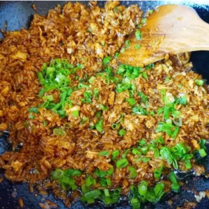 3.锅里重新倒油,放入一部分葱花爆香,倒入拌好的米饭炒散,不要有粘连。再把炒好的鸡蛋倒进去,如果颜色不够可以再调些酱油或者蚝油都可以,咸度自己掌握。