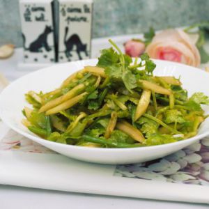 黄瓜切丝,小葱香菜切段,青椒去籽去筋切细丝