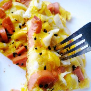 锅里放少许油,加入花卷碎和火腿丁翻炒1分钟后加入鸡蛋液