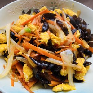 泡好的木耳一把,切丝。胡萝卜,圆葱切丝备用