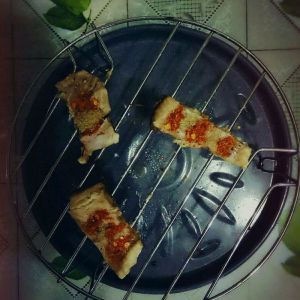 2.把鱼块放在微波炉烤架上,高火或烧烤档5分钟(不同品牌机器不同,请随时查看,避免烤糊)