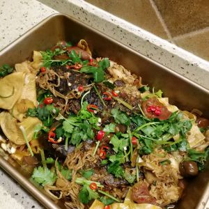 低油里一吃加入香锅料 辣酱 酱 一半的蒜末各种菜(按照有生到熟的顺序)加入冰糖 海鲜酱油 料酒 黄酒。一定留一些汤汁,别收太干。把才和汤都放到鱼上面,让鱼吸足汁水。浸泡一段时间。