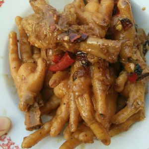 翻炒一段时间后,倒入水淹过鸡爪,大火进行入味收汁,等到汁少于一半时进行翻炒,炒到差不多了就可以装盘了,再撒上小葱装饰