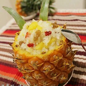 糯米饭趁热拌入葡萄干、枸杞、冰糖、菠萝果肉及果汁,拌匀后填入菠萝容器,上屉蒸20分钟即可。