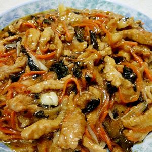 锅加热,放油,将葱姜蒜爆锅,胡萝卜丝木耳炒香,放入肉丝