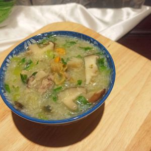 等粥熬粘稠了就把把炒好的扇贝肉跟香菇倒进锅里面,小火熬一下,熬个三五分钟。最后把青菜碎也倒进去就可以了.加入调料