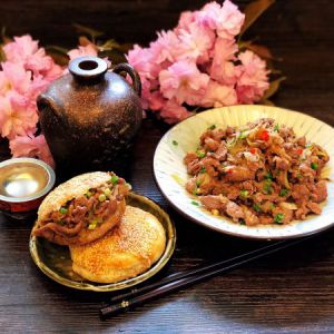 香酥的芝麻烧饼配上刚出锅的葱爆羊肉。