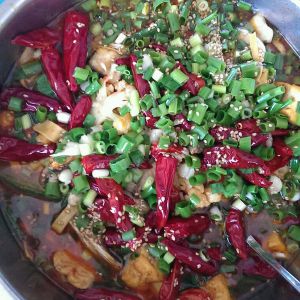 油绕热下豆瓣酱和蒜爆香(喜欢辣味更纯的可以放点小米辣炒炒),再倒入适量水,放入煎的鱼骨,再下豆腐和菜炖,加一勺盐,少许白胡椒花椒粉和酱油炖一会儿,最后下鱼片,盖锅盖大火闷一会儿,鱼片熟了就可以倒入大盆里了,再撒上葱花和炒过的辣椒,油烧热了撒上,加少许白芝麻点缀,开吃啦