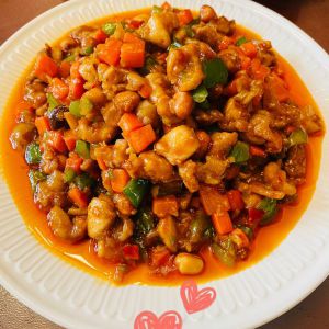 油放郫县豆瓣酱 葱姜蒜 鸡肉 (放料酒,糖)胡萝卜 青椒 黄瓜 花生米 最后放盐