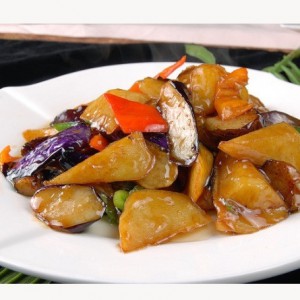 3)锅中多倒一些油,大火加热至8成热时,分别将土豆片和茄子块炸成金黄色后捞出。