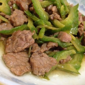 然后将苦瓜铲到锅边,放牛肉翻炒至变色再将苦瓜一起翻炒片刻,出锅前放盐调味即可。