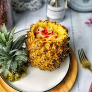 装入掏空的菠萝壳中再蒸制10分钟左右。