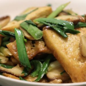 然后把煎好的豆腐放入盘中,再起锅放油。油温差不多时放入香菇翻炒几下。倒入刚才煎好的豆腐一起翻炒。加入少许糖、老酒增香、一勺美味鲜、一勺海天的黄豆酱、少许开水。大伙调中火,闷两分钟,等收汁差不多时加入切好的大蒜苗,翻炒几下,再加一丢丢的鸡精。