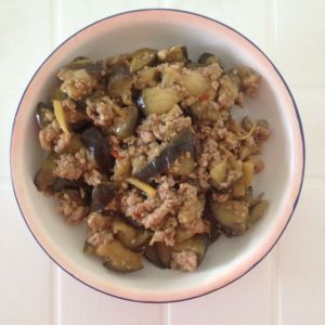 锅内留少许油,放入姜丝和蒜蓉翻烧一下,待香味溢出,放入腌制好的肉末翻炒,炒至肉末变色加入茄子,然后放入少许鸡精调味,再加入辣椒酱翻炒。