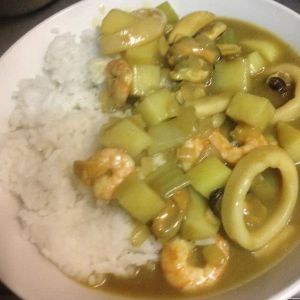 水开后放咖喱块,放后不停搅动防止粘锅,最后放西芹,慢火煮5分钟