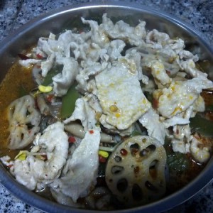 将煮好的肉片连汤一起盛入煮好的菜里,就大功告成了,我不太吃辣的,所以就没在上面放辣椒面和热油,喜欢吃辣的朋友可以放点辣椒面然后用热油淋下去,味道会更美的哦