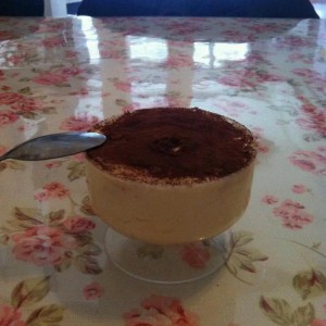 6.将朗姆酒和咖啡混合,用手指饼干泡一下,装入容器,倒入马斯卡朋