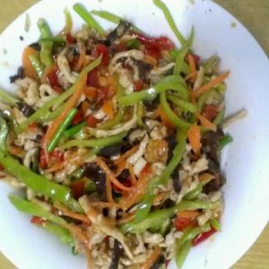 将黑木耳,青椒,胡萝卜切丝,按理说应该还有笋丝,可惜我没有,所以就用蒜苔凑数了