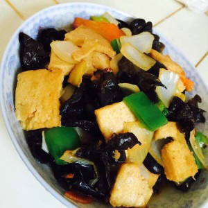 留底油,葱姜蒜炒出香味,放木耳,胡萝卜,青椒翻炒,放少许盐,酱油