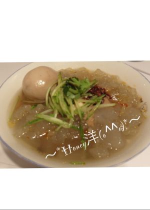 煎粉炒好,盛入碗中,放盐、鸡精、麻酱、蒜末,酱油,醋,辣椒油、香菜末,黄瓜丝,茶蛋,最后加适量开水就OK啦