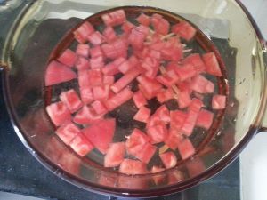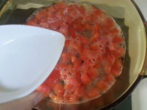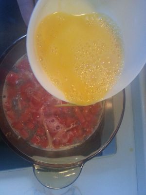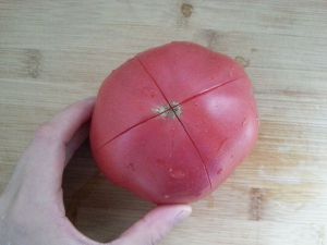 番茄清洗干净划十字花刀,开水里滚一圈后去皮切丁。