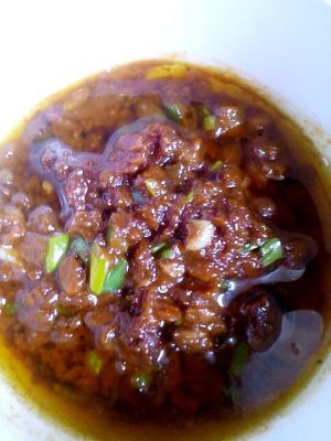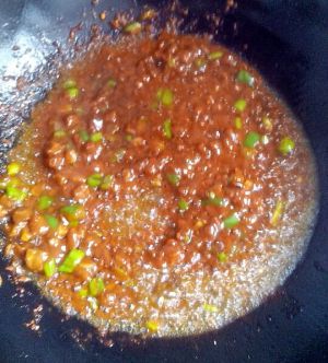 锅中加入适量油, 油热后,加入肉炒至变色, 在加入葱蒜,辣椒翻炒几下。