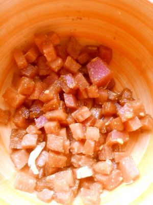 将里脊肉切丁, 加入适量酱油 ,花椒粉, 姜粉, 料酒,淀粉拌匀后, 腌制10分钟左右。