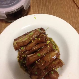 油热,加入白糖(冰糖),待融化后,放入排骨,翻炒均匀裹上糖色。