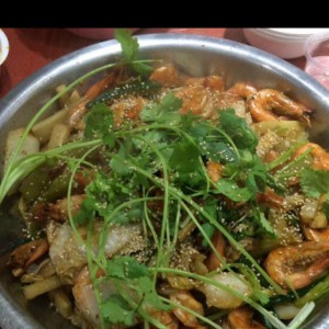 油锅加入姜,蒜,洋葱,大葱,煸炒出香味,加入麻辣香锅包炒开。(麻辣香锅包是干的粉末,所以我把腌制虾沥出的水加进来了。香锅调料可根据个人口味加,我放了半包都觉得辣。)加入所有食材炒开,就可以装盘啦。最后撒芝麻,加香菜,ok!