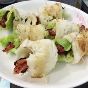 用生菜包培根,馒头卷。然后牙签固定