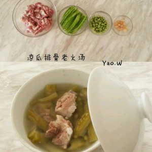 将排骨洗净,苦瓜任意切成方便吃的模样,黄豆泡水,瑶柱清洗一下即可