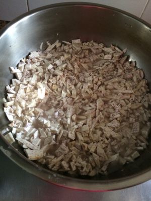 切成碎粒,方便煮烂!加入少量水,一边煮一边拌