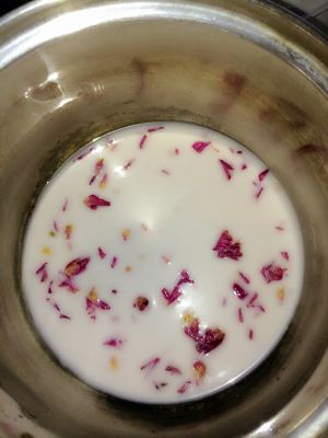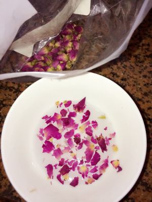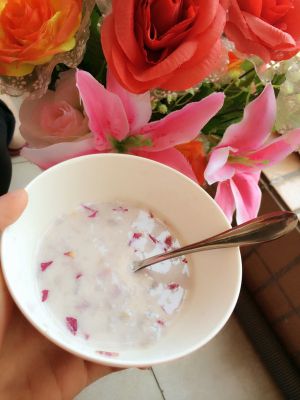 椰浆些许,放入玫瑰花,混点糖水,甜度自己定制, 开火热一下,玫瑰花香跟椰浆糖水更能融为一体