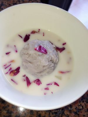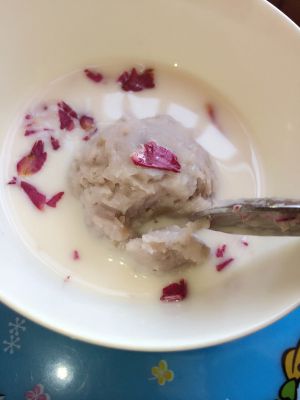 也可以把球弄泥,与玫瑰花椰汁混合吃。玫瑰花香与椰汁在口中沁人心脾。 其实也可以加入西米,变成【玫瑰花椰汁西米芋】