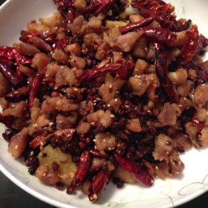 锅留底油,放入葱姜,炒出香味,放辣椒和麻椒,炒的颜色发棕红,加入鸡腿继续翻炒,洒入白糖,白芝麻后翻炒均匀后即可出锅。